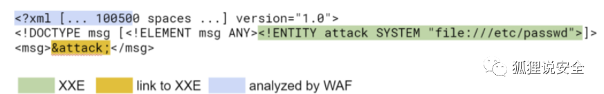 这意味着未读取文件内容的WAF将不会读取文档中实体的声明。而指向未知实体的链接又会阻止XML解析器导致错误。