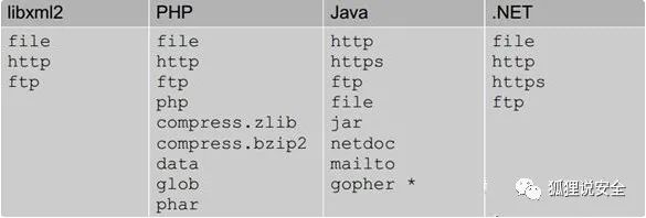 libxml2:file、http、ftp``PHP:file、http、ftp、php、compress.zlib、compress.bzip2、data、glob、phar``Java:file、http、ftp、https、jar、netdoc、mailto、gopher``.NET:file、http、ftp、https