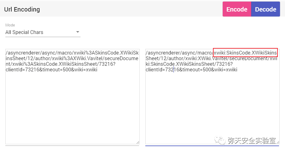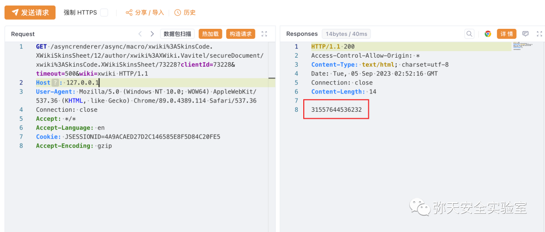 GET /asyncrenderer/async/macro/xwiki%3ASkinsCode.XWikiSkinsSheet/12/author/xwiki%3AXWiki.Vavitel/secureDocument/xwiki%3ASkinsCode.XWikiSkinsSheet/73216?clientId=73216&timeout=500&wiki=xwiki HTTP/1.1``Host: 127.0.0.1``User-Agent: Mozilla/5.0 (Macintosh; Intel Mac OS X 10_10_1) AppleWebKit/537.36 (KHTML, like Gecko) Chrome/37.0.2062.124 Safari/537.36``Connection: close``Accept: */*``Accept-Language: en``Cookie: JSESSIONID=A86B7F535B096996008E272EAD837DD7``Accept-Encoding: gzip