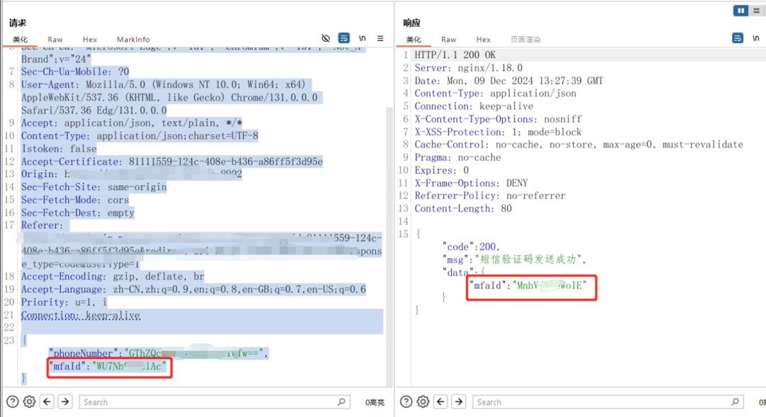 POST /prod-api/xxxr/xxx/send-sms HTTP/1.1``Host: xxxx``Cookie: xxxxxx``Content-Length: 65``Sec-Ch-Ua-Platform: “Windows”``Sec-Ch-Ua: “Microsoft Edge”;v=”131”, “Chromium”;v=”131”, “Not_A Brand”;v=”24”``Sec-Ch-Ua-Mobile: ?0``User-Agent: Mozilla/5.0 (Windows NT 10.0; Win64; x64) AppleWebKit/537.36 (KHTML, like Gecko) Chrome/131.0.0.0 Safari/537.36 Edg/131.0.0.0``Accept: application/json, text/plain, */*``Content-Type: application/json;charset=UTF-8``Istoken: false``Accept-Certificate: 81111559-124c-408e-b436-a86ff5f3d95e``Origin: xxxxxxx``Sec-Fetch-Site: same-origin``Sec-Fetch-Mode: cors``Sec-Fetch-Dest: empty``Referer: xxxxxxx``Accept-Encoding: gzip, deflate, br``Accept-Language: zh-CN,zh;q=0.9,en;q=0.8,en-GB;q=0.7,en-US;q=0.6``Priority: u=1, i``Connection: keep-alive`` ``{“phoneNumber”:”手机号加密”,”mfaId”:”TMAxxxxxUupr”}