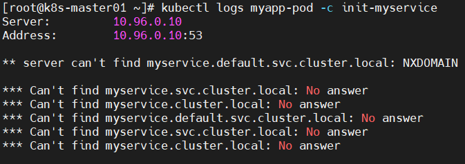 waiting for myserviceServer: 10.96.0.10Address: 10.96.0.10:53** server can't find myservice.default.svc.cluster.local: NXDOMAIN*** Can't find myservice.svc.cluster.local: No answer*** Can't find myservice.cluster.local: No answer*** Can't find myservice.default.svc.cluster.local: No answer*** Can't find myservice.svc.cluster.local: No answer*** Can't find myservice.cluster.local: No answer