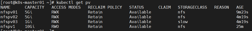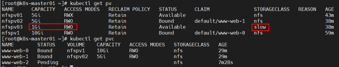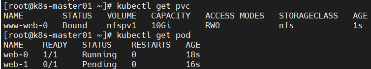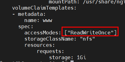 accessModes与可使用的PV不一致,导致无法挂载PVC,由于只能挂载大于1G且accessModes为RWO的PV,故只能成功创建1个pod,第2个pod一致pending,按序创建时则第3个pod一直未被创建;