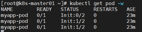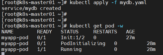 NAME READY STATUS RESTARTS AGEmyapp-pod 0/1 Init:1/2 0 27mmyapp-pod 0/1 PodInitializing 0 28mmyapp-pod 1/1 Running 0 28m