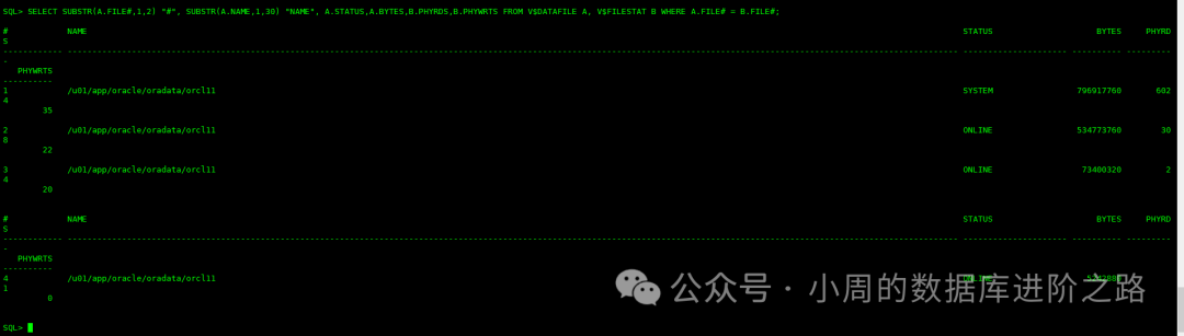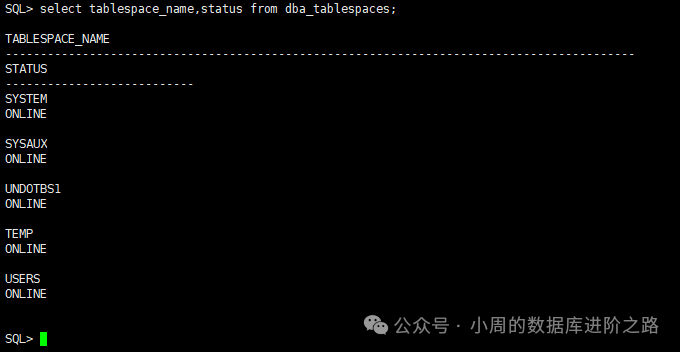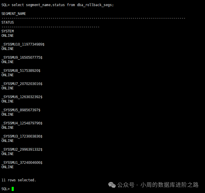 说明:输出结果中所有回滚段的“STATUS”应该为“ONLINE”。