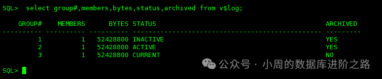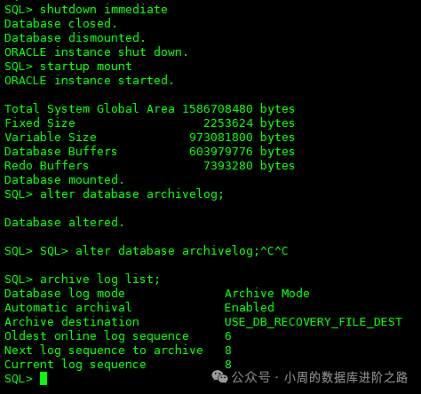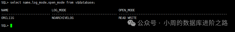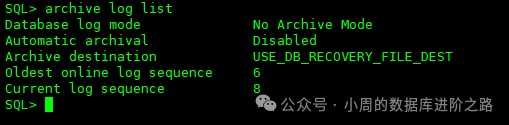 说明:两个命令都可以查看。“LOG_MODE”表示Oracle当前的归档方式。“ARCHIVELOG”表示数据库运行在归档模式下,“NOARCHIVELOG”表示数据库运行在非归档模式下。在我们的系统中数据库必须运行在归档方式下。