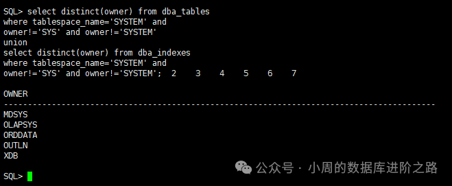 说明:如果记录返回,则表明system表空间内存在一些非system和sys用户的对象。应该进一步检查这些对象是否与我们应用相关。如果相关请把这些对象移到非System表空间,同时应该检查这些对象属主的缺省表空间值。