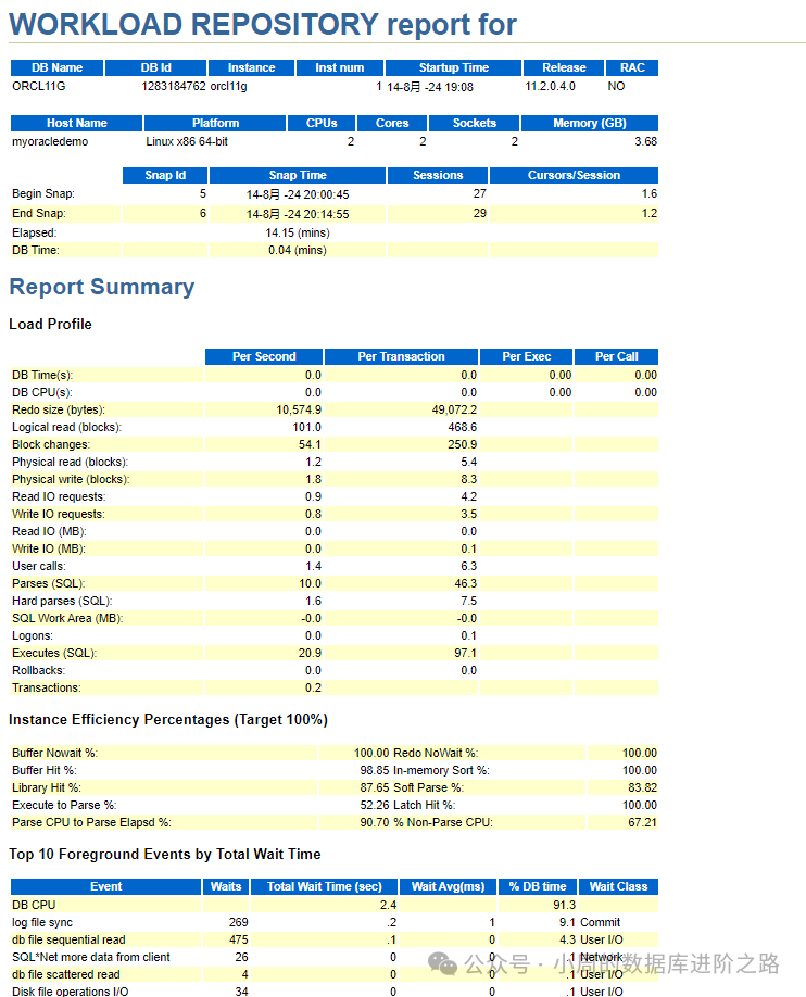说明:如果数据库长时间持续出现大量像latch free,enqueue,buffer busy waits,db file sequential read,db file scattered read等等待事件时,需要对其进行分析,可能存在问题的语句