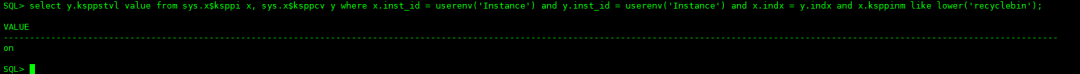 SQL> select y.ksppstvl value from sys.x$ksppi x, sys.x$ksppcv y where x.inst_id = userenv('Instance') and y.inst_id = userenv('Instance') and x.indx = y.indx and x.ksppinm like lower('recyclebin');