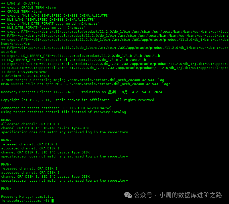 rman target / nocatalog msglog /home/oracle/scripts/del_arch_${deltime}.log<<EOF -
