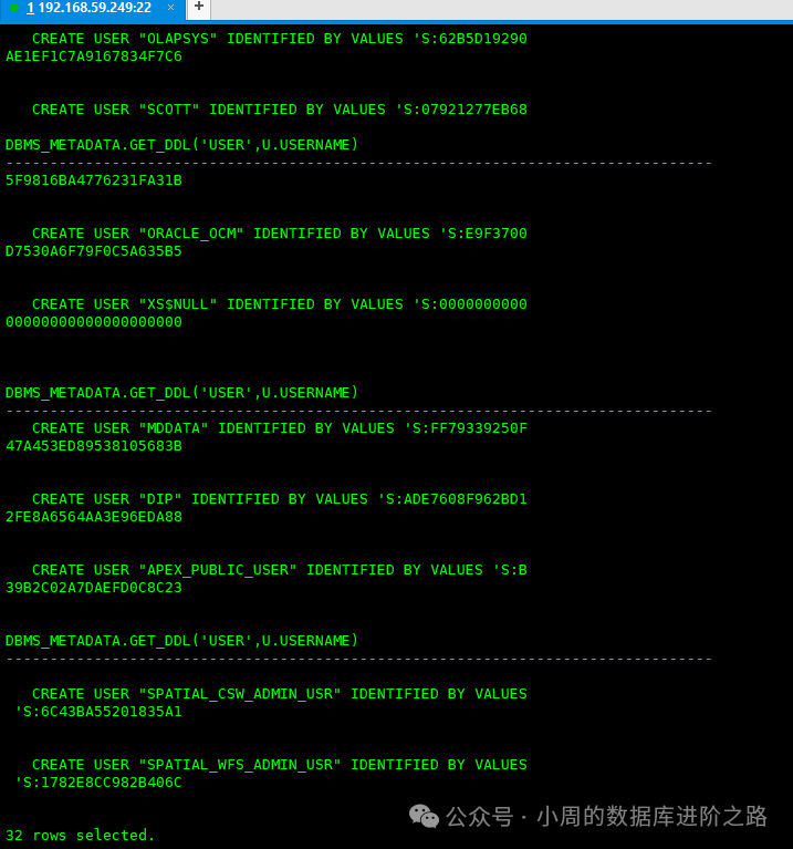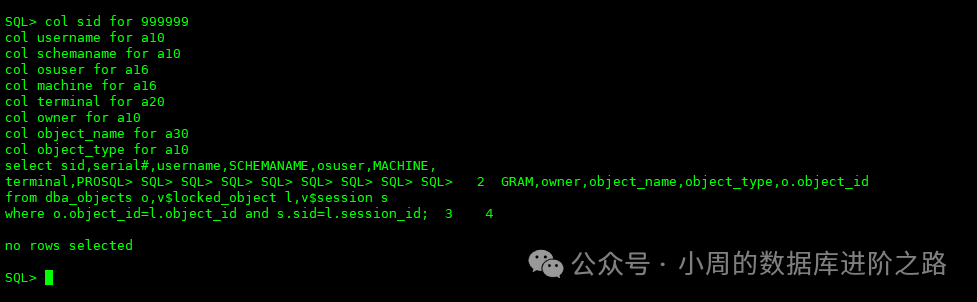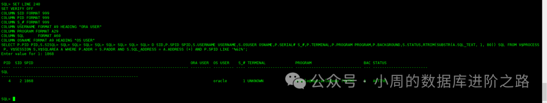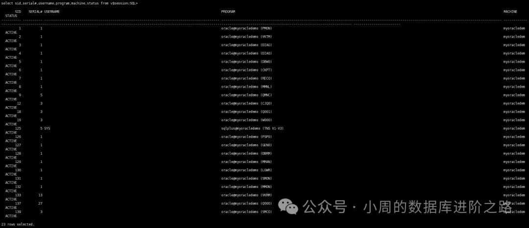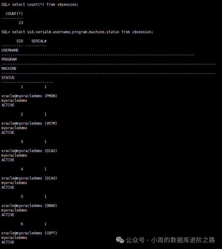 注意:上例中SID为1到10(USERNAME列为空)的会话,是Oracle的后台进程,不要对这些会话进行任何操作。