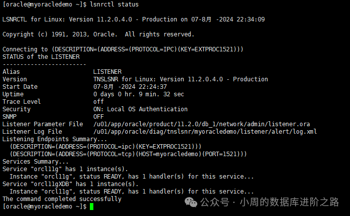 说明:“Services Summary”项表示Oracle的监听进程正在监听哪些数据库实例,输出显示中至少应该有“orcl11g”这一项。