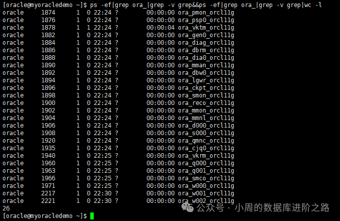 [oracle@myoracledemo ~]$ ps -ef|grep ora_|grep -v grep&&ps -ef|grep ora_|grep -v grep|wc -l