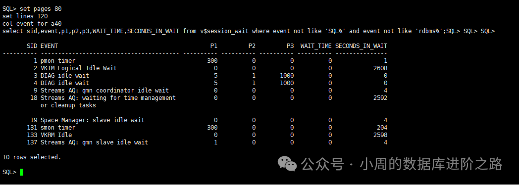 SQL>select sid,event,p1,p2,p3,WAIT_TIME,SECONDS_IN_WAIT from v$session_wait where event not like 'SQL%' and event not like 'rdbms%';