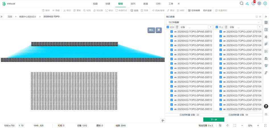 32台SPINE与64台LEAF通过CLOS连接模版一键连接;