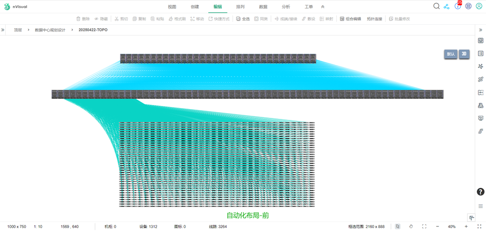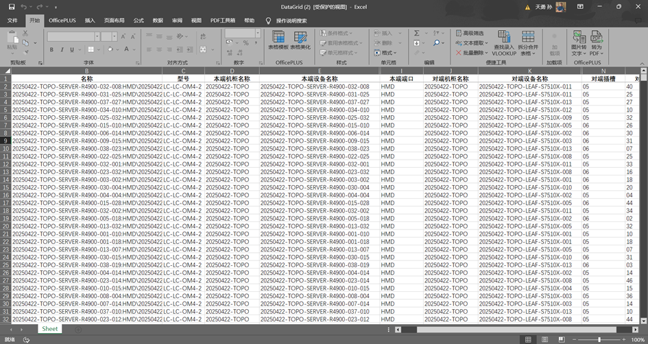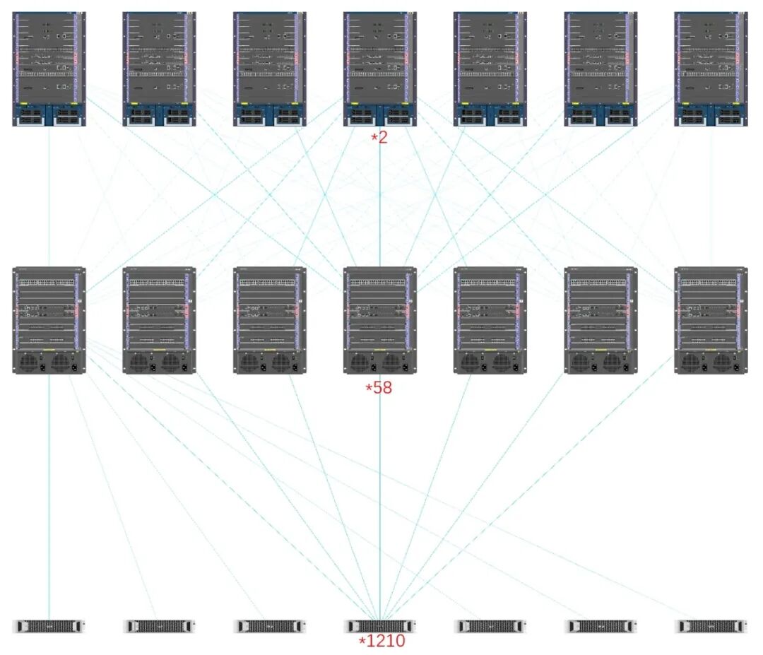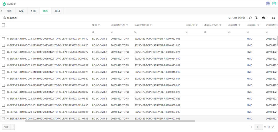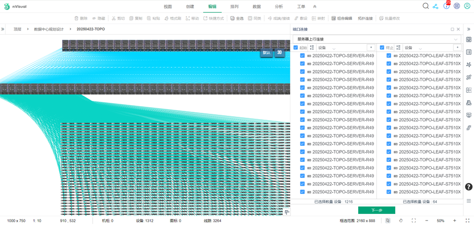以32台SPINE、64台LEAF和1216台服务器为例,使用nVisual拓扑规划工具,可在20分钟内轻松完成整个拓扑设计,并一键导出端口互联数据,高效精准: