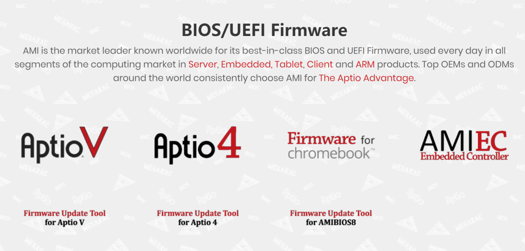 AMI 主要产品线有 UEFI BIOS 固件与控制器(EC)、MegaRAC 远程固件管理解决方案、AMI 背板控制器产品系列、诊断实用程序和工程服务。其中,Aptio V 是 AMI 的最新一代 UEFI BIOS 固件,可满足所有平台(X86与非X86)的需求。Aptio 4则从传统 BIOS 演化而来,同样符合 UEFI 规范。在针对 UEFI 的支持服务方面,AMIDiag 目前是市场上唯一可用的硬件诊断解决方案。