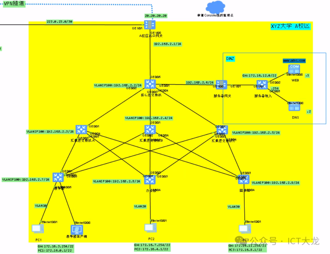 A校区的网络架构为接入层、汇聚层与核心层。终端设备上的网关设在接入层上面。