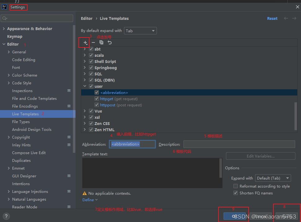这样在vue页面输入第4步定义的前缀提示词,IDEA会弹出选项,选中对应的模板名称,按回车即可快速生成模板代码,比如在4步中定义的前缀名称为vue,新建一个vue文件,在文件输入vue,选择对应模板按回车即可,其他httpget、httppost也是一样的道理。