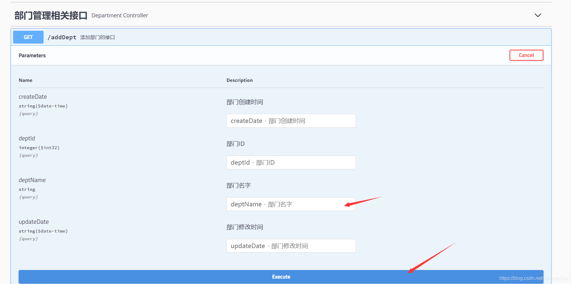 (4)填写相关参数后点击执行,由于其他三个参数设置了非必须,这里只填一个部门名字即可