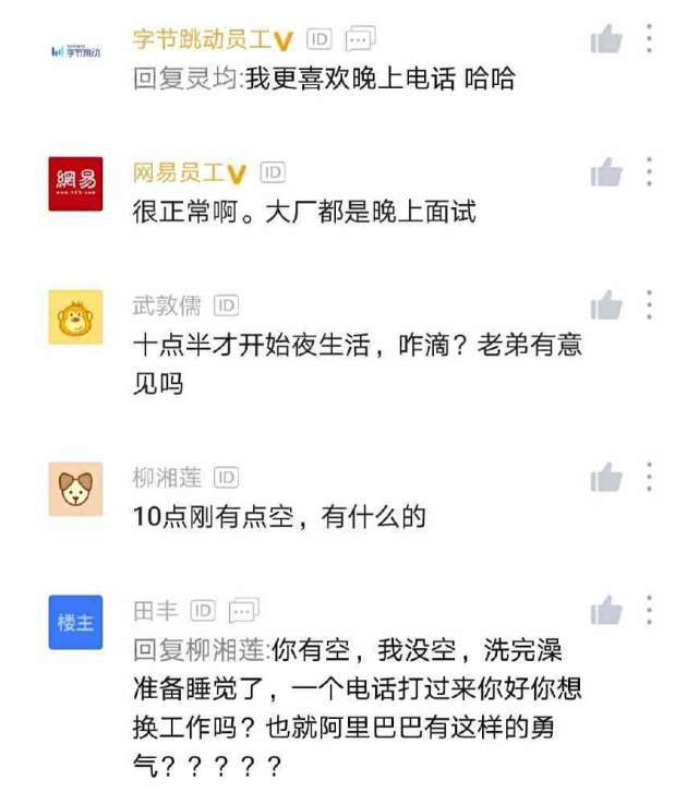 不过有大厂员工表示这很正常 努力工作奋斗,利用晚上时间进行招聘没毛病,不过楼主进行了激烈的回应:你有空,我没空,洗完澡准备睡觉了,一个电话打过来你好你想换工作吗?也就阿里巴巴有这样的勇气?
