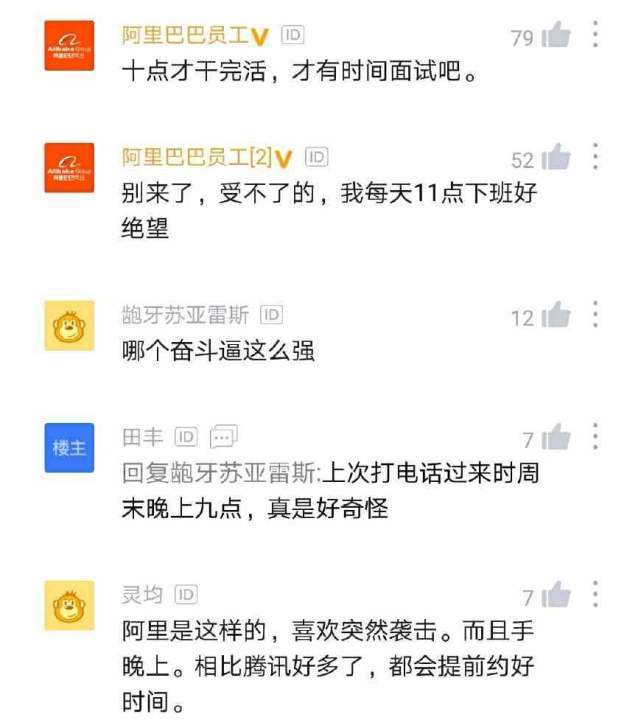 下面是另外一些程序员的回应,其中不乏标签为阿里的员工:正常点呀,我记得当时九点跟我沟通;下了班才有空面试,就是这强度;下半年十一月到春节基本都这样,也好,彼此直接都知道是否合适了;这很正常啊!业务一般都9点后处理面试;不要太正常,10点刚开完会,挤出宝贵时间来面试,已经很不错了;说实话挤出这点时间已经不容易了,至少我是这样的,忙的晕头转向的。