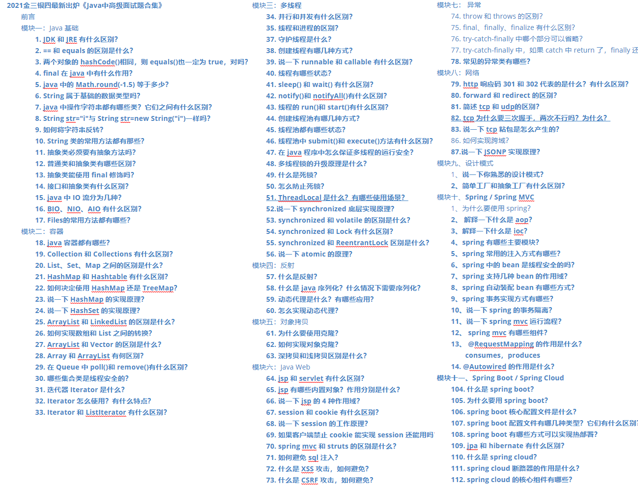在与他们交谈中,问了他们在面试中遇到了哪些问题,经过一个月时间,我把从他们那收集到的问题进行了分类整理,经过多方面资料查阅以及和我朋友James(阿里P8)咨询探讨后,最终整理成两份面试笔记《2022金三银四最新Java中高级面试题合集》《2022Java高级架构面试点解析》;第一份笔记给这些面试问题做了详细的解答;第二份笔记则对于面试问题进行了剖析,分析了面试官考察的动机以及答题时要怎么才能答得完美。