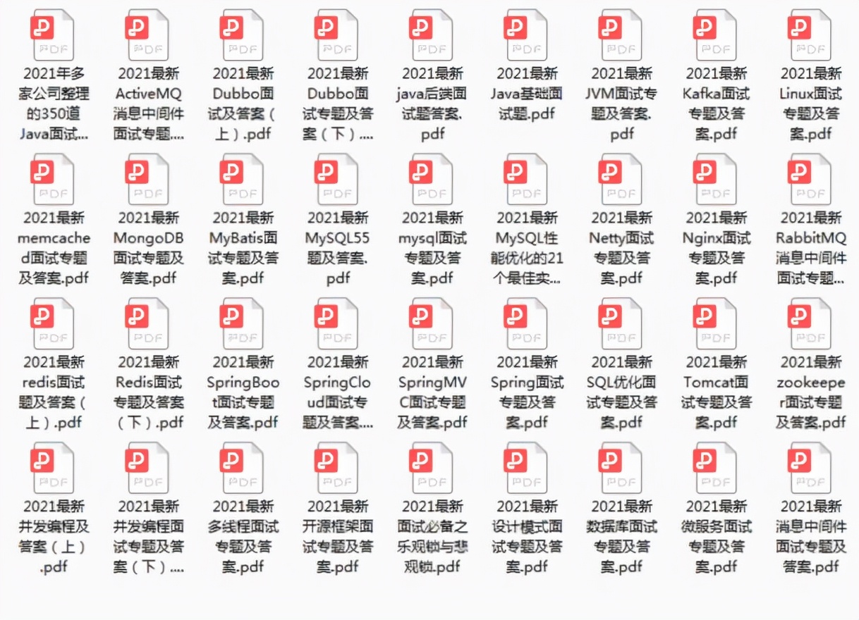 另外本人整理了21年面试题大全,包含spring、并发、数据库、Redis、分布式、dubbo、JVM、微服务等方面总结,下图是部分截图,需要的话私信我【Java】领取