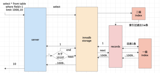 MySQL limit不会传递到引擎层,只是在服务层进行数据过滤。查询数据时,先由引擎层通过索引过滤出一批数据(索引过滤),然后服务层进行二次过滤(非索引过滤)。