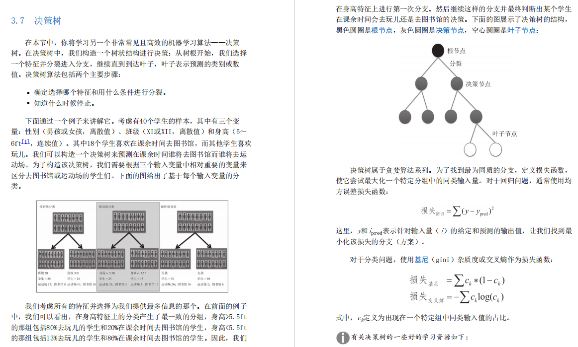 在本节中,你将学习另一个非常常见且高效的机器学习算法——决策树。在决策树中,我们构造一个树状结构进行决策:从树根开始,我们选择一个特征并分裂进入分支,继续直到到达叶子,叶子表示预测的类别或数值。