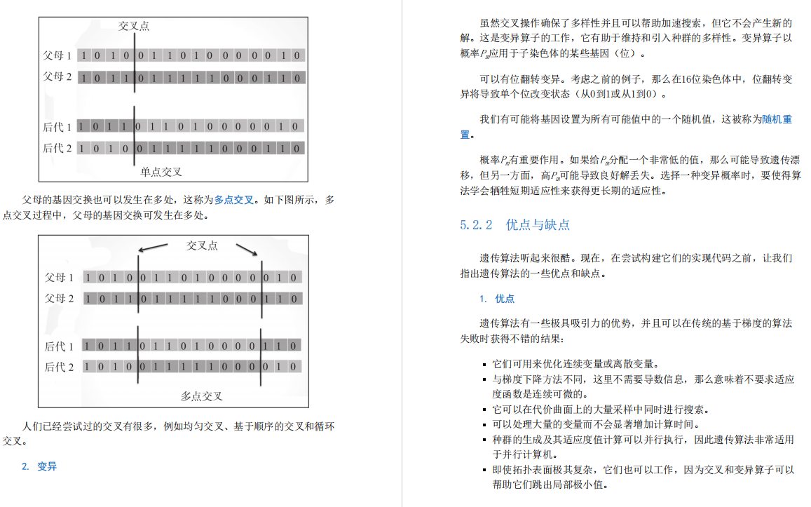 为了进行交叉操作,我们在两个亲本染色体上选择一个随机位置,然后在该位置上以概率Px交换它们的遗传信息。这产生了两个新的后代。当交叉发生在随机位置时,其被称为一点交叉(或单点交叉)。如下图所示,一点交叉过程中,在亲本染色体中选择一个随机位置,并交换相应的基因。