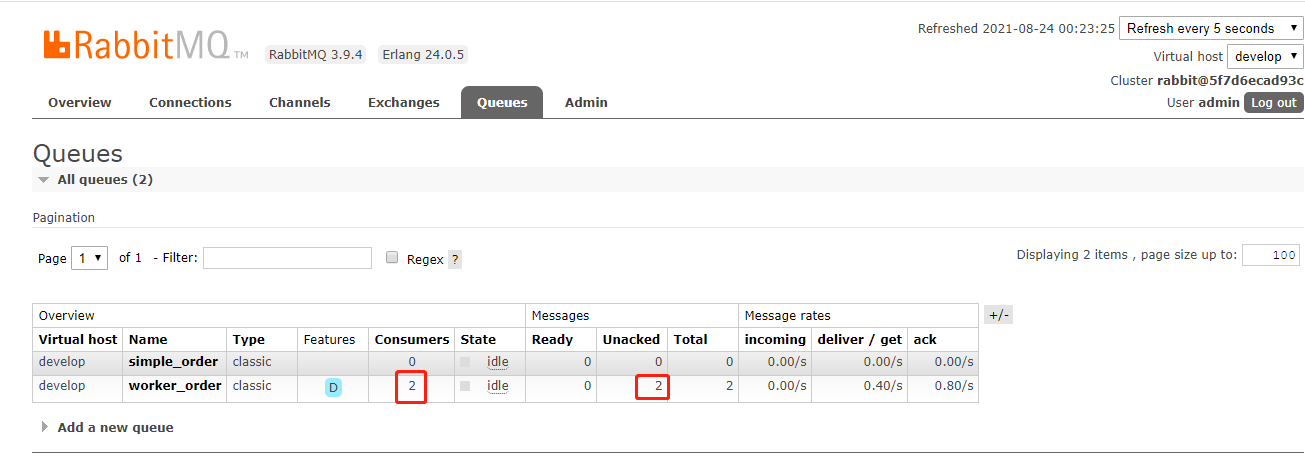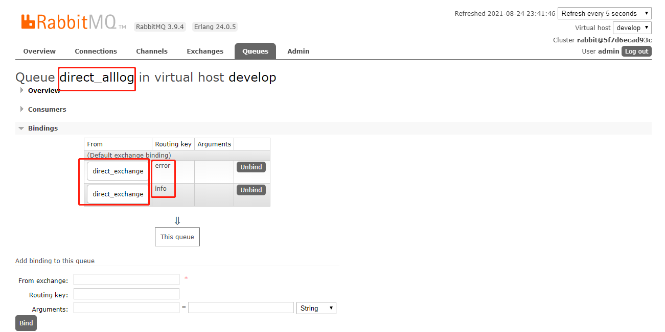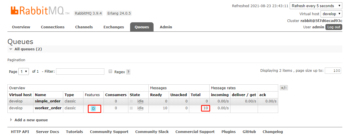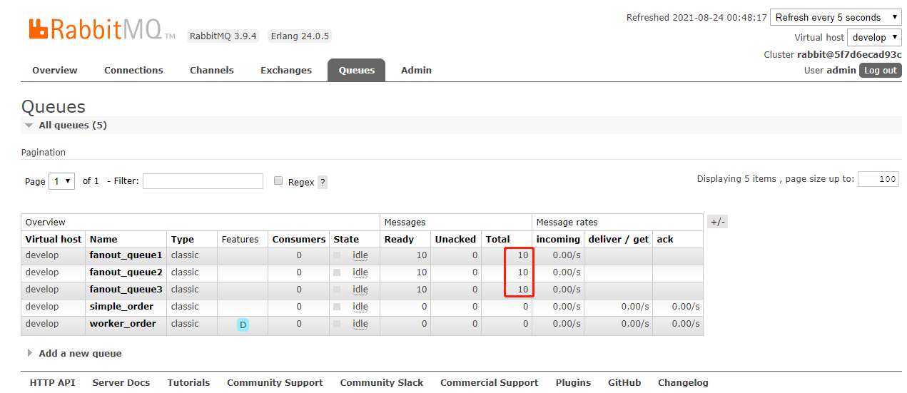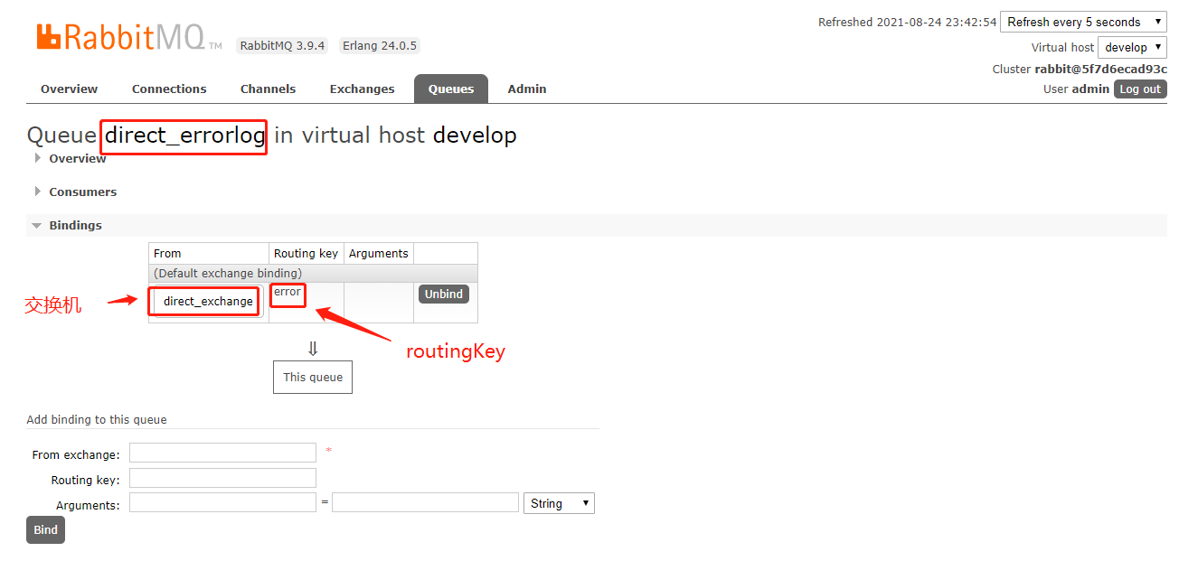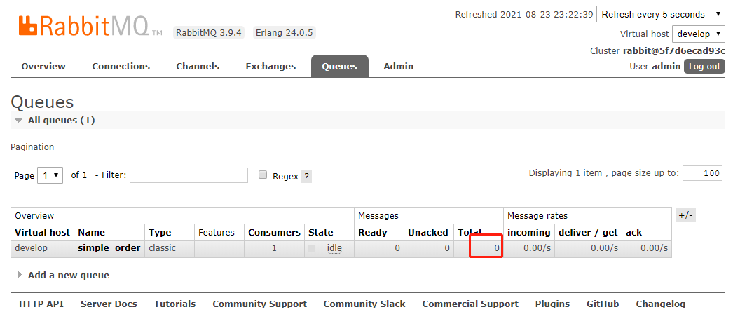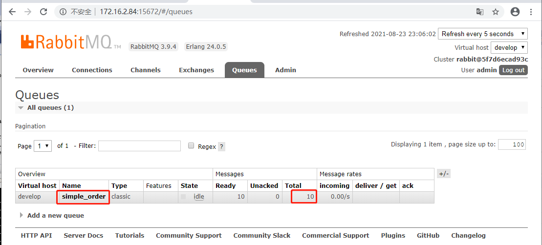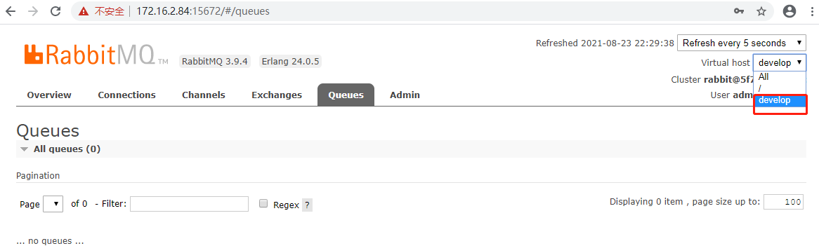 建一个名为develop的Virtual host(虚拟主机)使用,项目中一般是一个项目建一个Virtual host用,能够隔离队列。