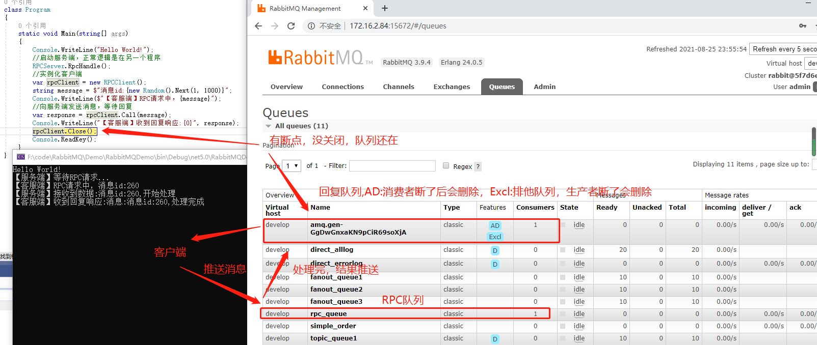 - 客户端为RPC请求设置2个属性:replyTo:设置回调队列名字;correlationId:标记request。
