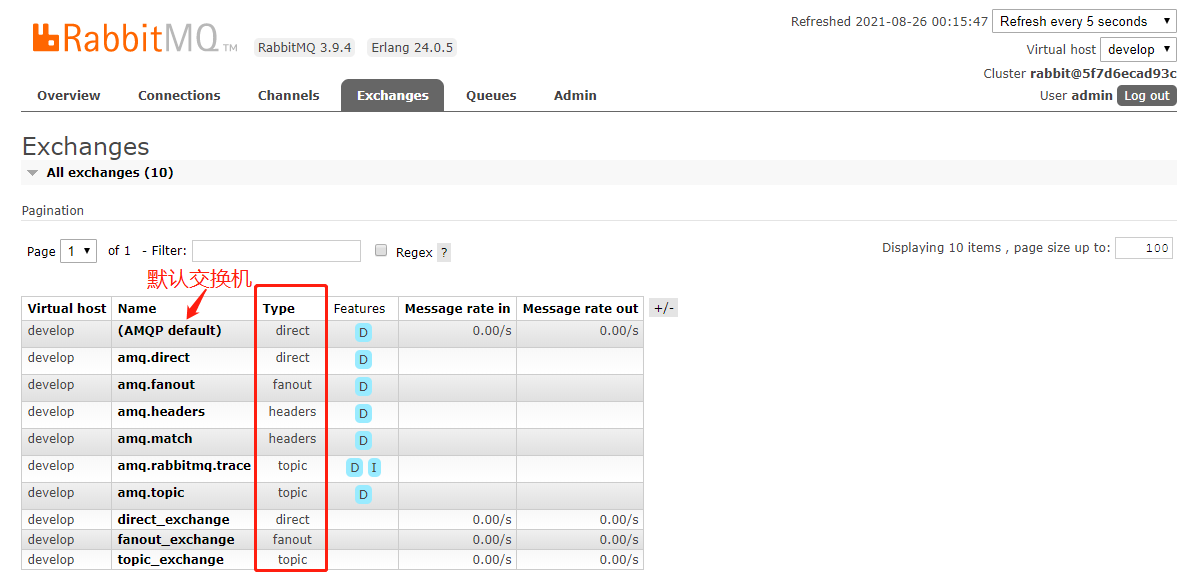 下面位置可以看到交换机类型,amq.开头那几个是内置的,避免交换机过多可以直接使用。