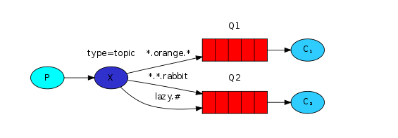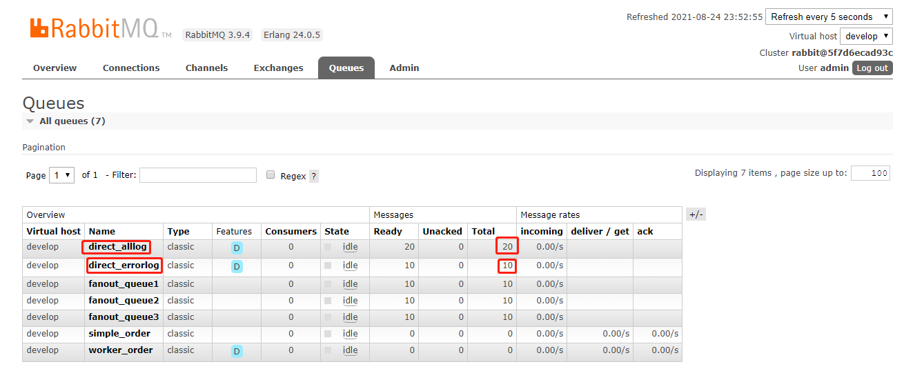 这里演示了 routingKey为aaa.orange.rabbit,和lazy.aa.rabbit的情况,第一个匹配到Q1和Q2,第二个匹配到Q2,所以应该Q1是10条,Q2有20条,