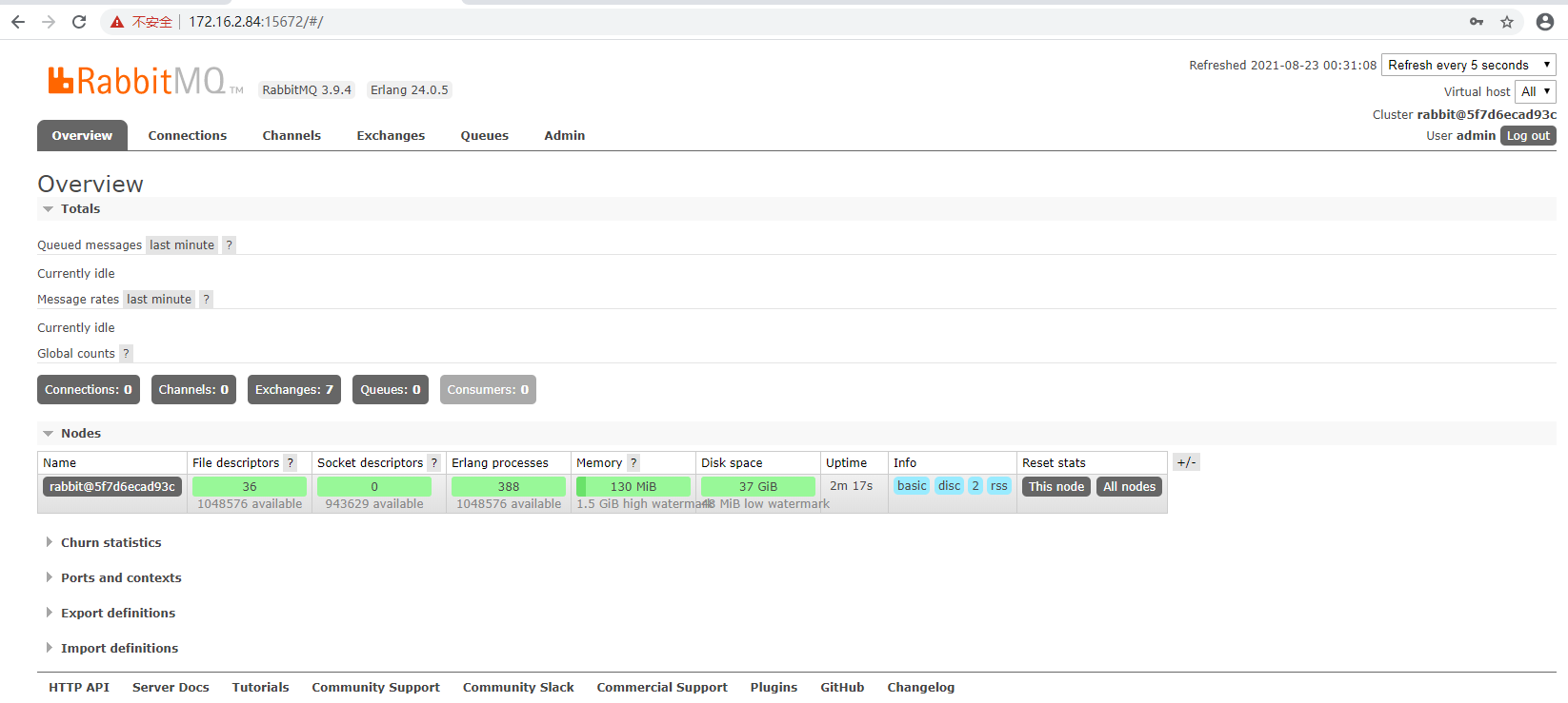 docker run -d --name rabbitmq -e RABBITMQ_DEFAULT_USER=admin -e RABBITMQ_DEFAULT_PASS=123456 -p 15672:15672 -p 5672:5672 rabbitmq:3-management