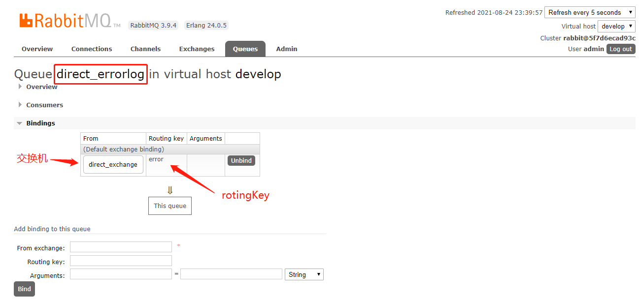 exchange:交换机,为什么能传空呢,因为RabbitMQ内置有一个默认的交换机,如果传空时,就会用默认交换机。