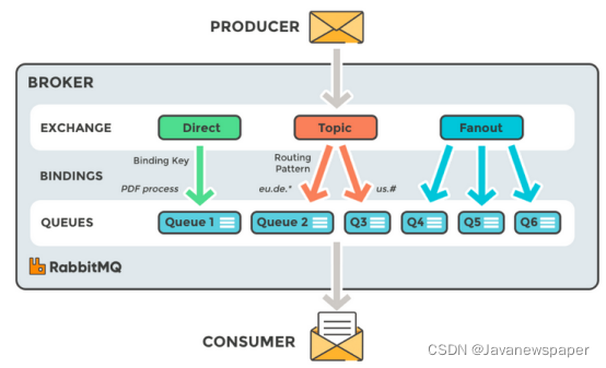 接受生产者发送的消息,并根据Binding规则将消息路由给服务器中的队列。ExchangeType决定了Exchange路由消息的行为。在RabbitMQ中,ExchangeType常用的有direct、Fanout和Topic三种。