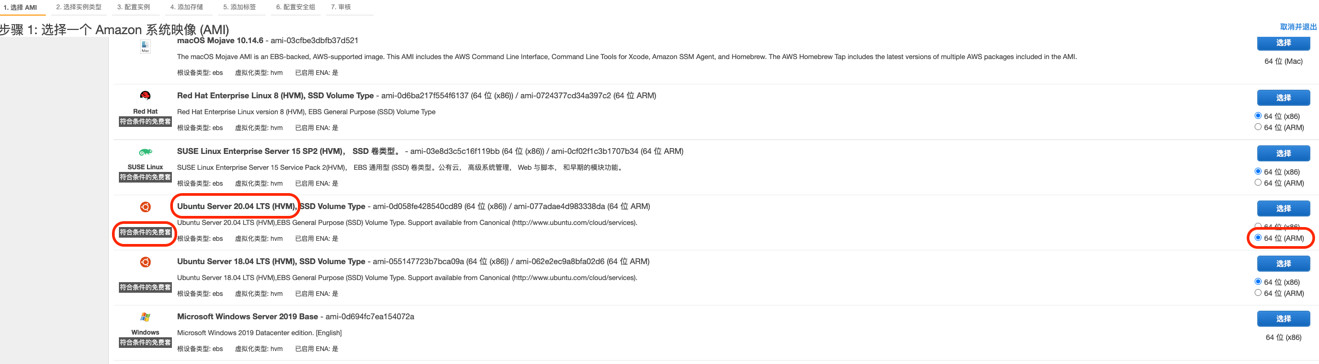 - 在选择操作系统页面,我们选择Ubuntu Server 20.04 LTS,并且在右侧选择系统版本为ARM。点击蓝色的“选择”按钮。在这里我们注意到,如果是免费套餐内的操作系统,会有标注“符合条件的免费套餐”。