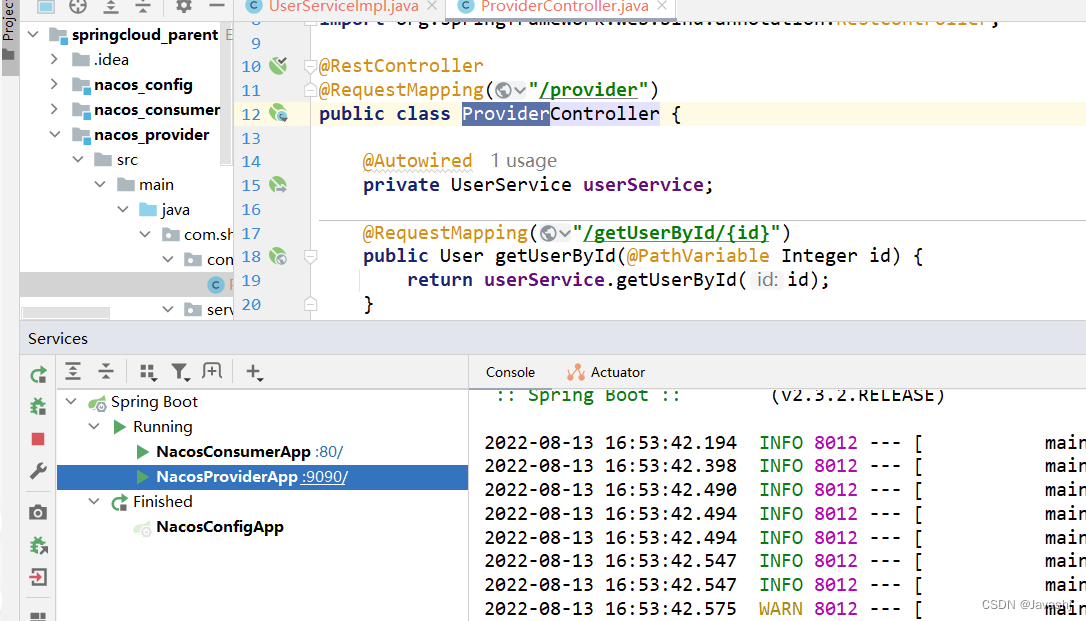 // ServiceInstance instance = discoveryClient.getInstances("nacos-provider").get(0);