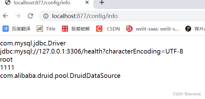 String configInfo = driverClassName+"<br>"+url+"<br>"+username+"<br>"