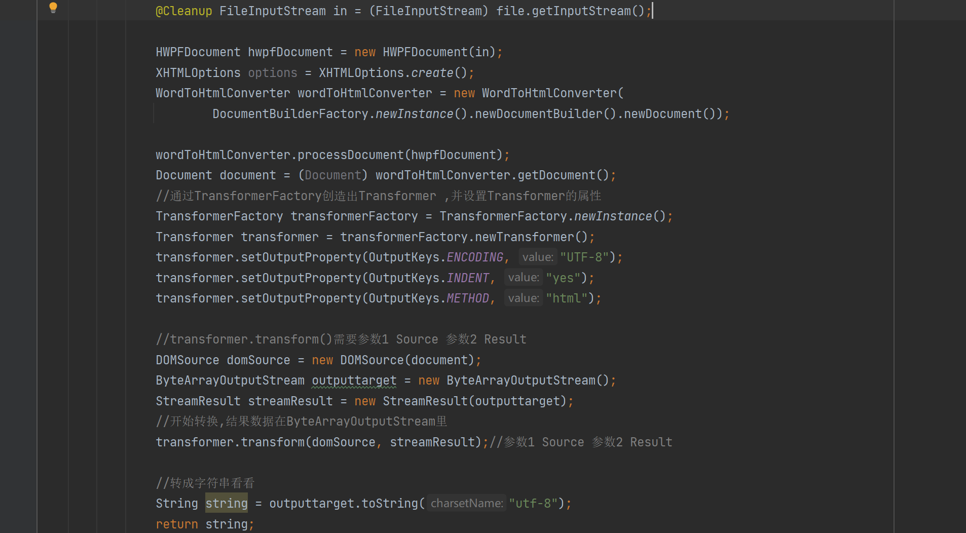 使用以上代码,您可以获取文档内容,包括文本以及文本的样式。我这里返回的是一个string,但是这个string不是纯文本,而是带有html格式的文本,这样下次在使用这个模板的时候,前端接收到数据,可以直接渲染到富文本编辑器,且保留格式,当然这是资讯过前端大佬之后,大佬给出的说法,具体实现还需要前端下一下功夫。