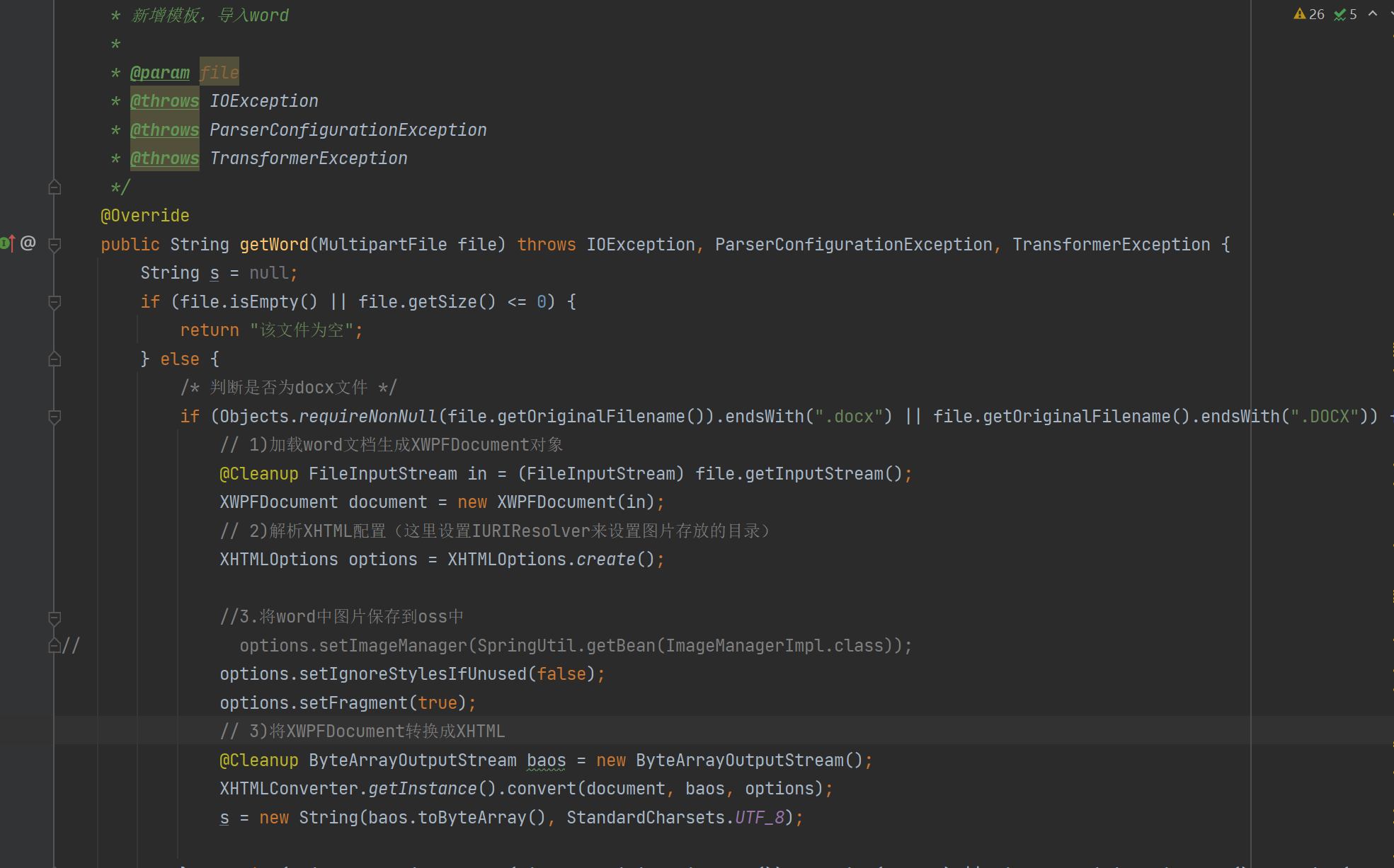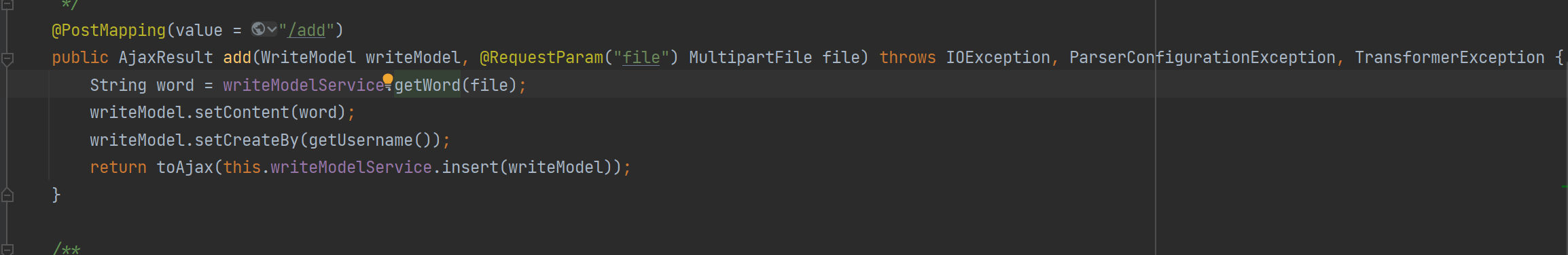 要导入Word文档,需要使用Java中的Apache POI库。因为本次导入不仅仅是导入模板,还需要导入之后进行写作模板的新增,所以这个接口在导入的时候,还需要传一个对象,那就不能像之前只传一个对象的时候,使用@RequestBody注解,进行接收前端传过来的参数,所以对这个接口进行了改造: