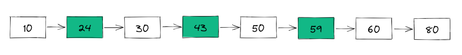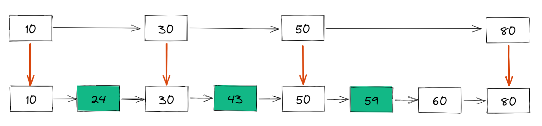 具体来说,我们把链表中的一些节点提取出来,作为索引,类似于二叉搜索树,得到如下结构: