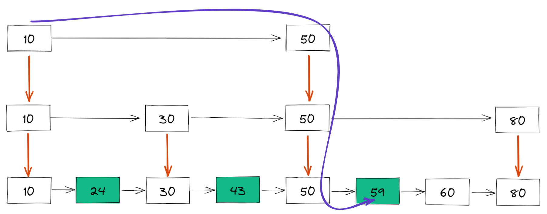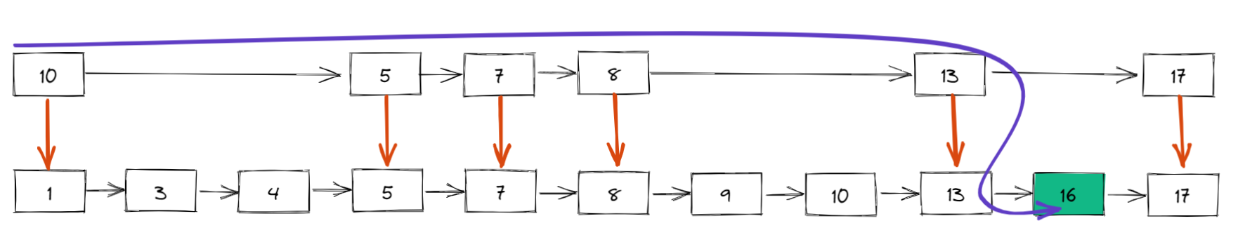 我们在每一个节点的基础上添加一个 down 指针,用来指向下一层的节点