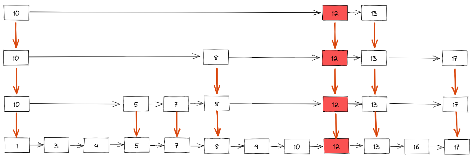 如下所示,插入新元素 12,假设概率算法返回的结果是 4,表示新元素需要插入到 4 级索引中,同时,我们还需要建立 3 级索引、2 级索引和 1 级索引(也就是原始有序链表)