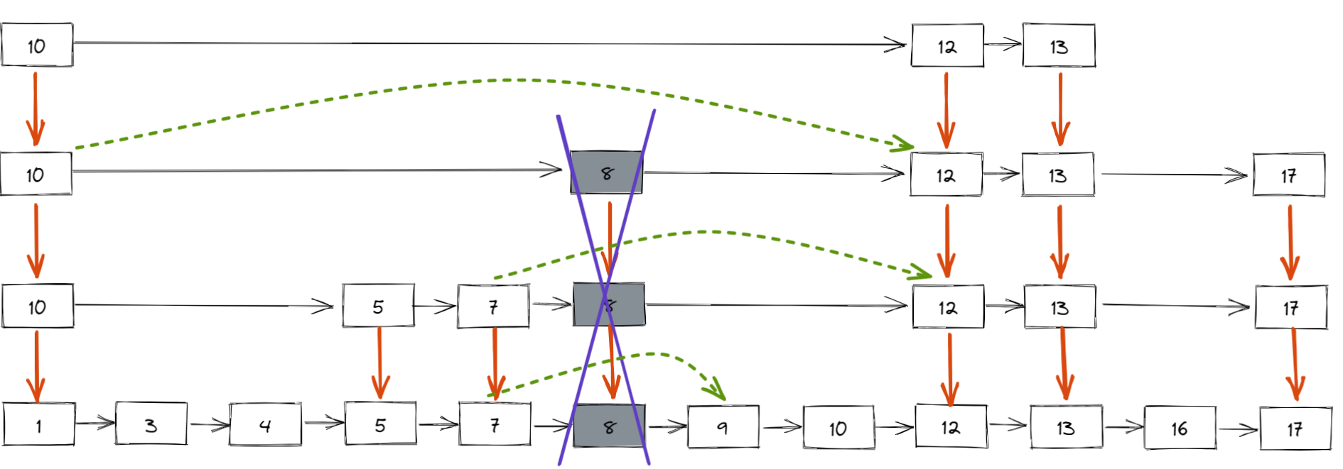 跳表删除数据时,要把索引中对应节点也要删掉。如下图所示,如果要删除元素 8,需要把原始链表中的 8 和第 2、3 级索引的 8 都删除掉。