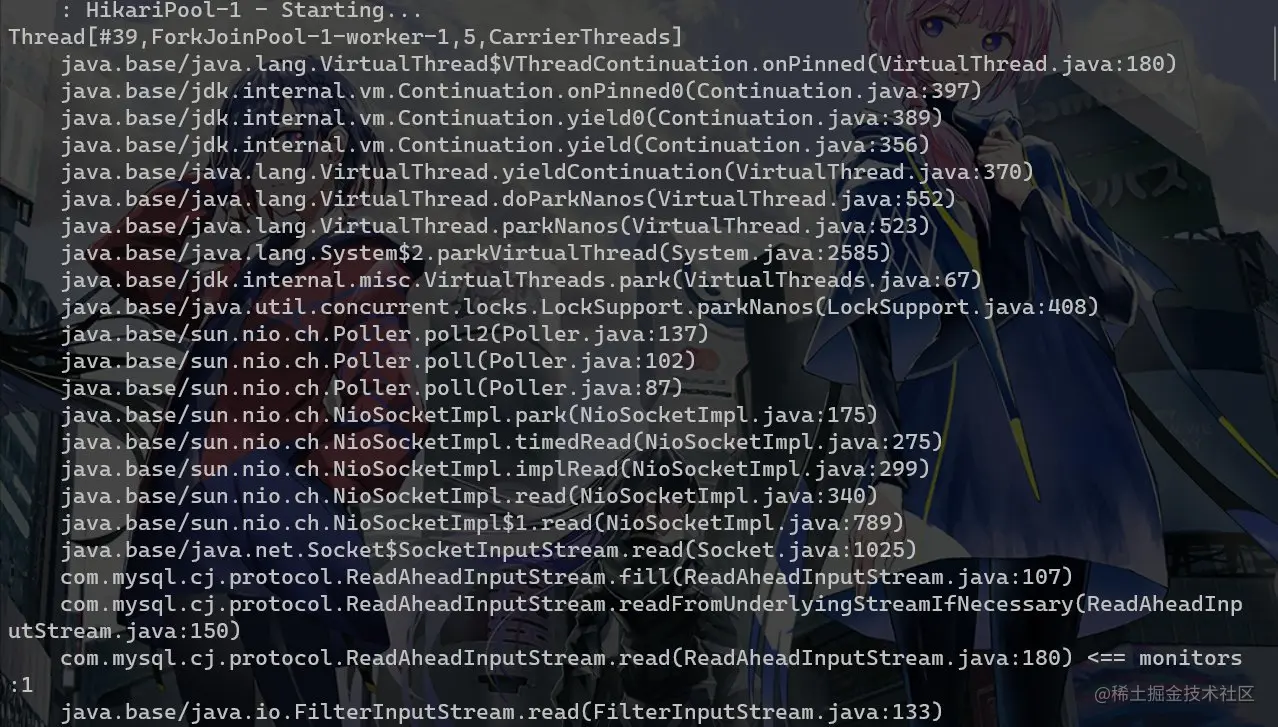 com.mysql.cj开头的堆栈的栈底有一个sychronized关键字加持的方法以防止多个线程读取同一个socket,因此在这里我们的线程就pin住了需要等待IO结束,这样又退回到原来的内核线程实现了
