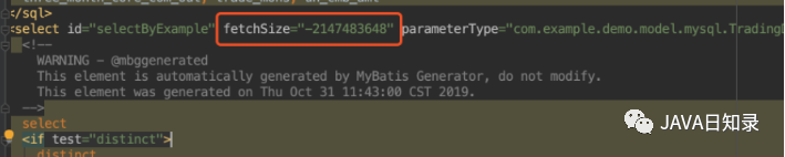 Mapper xml文件核心片段,以下两条select的唯一差异就是在stream获取数据的方式中多了一条属性:fetchSize="-2147483648"