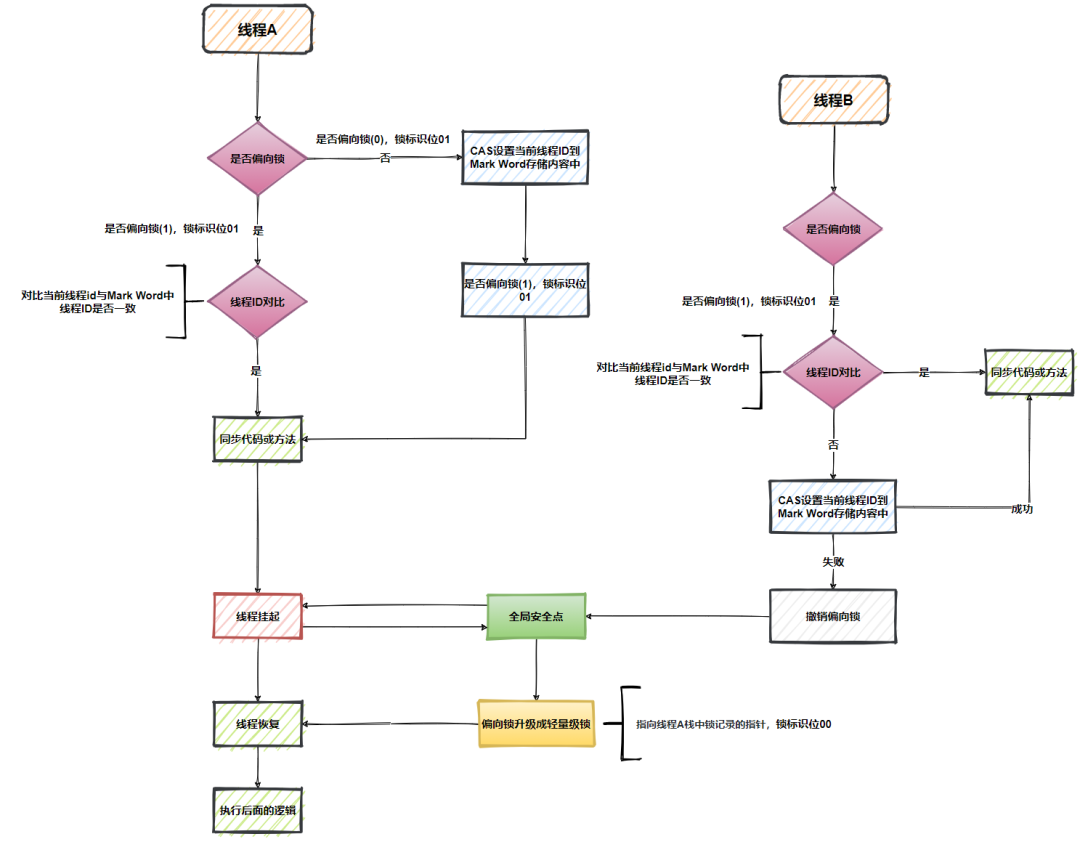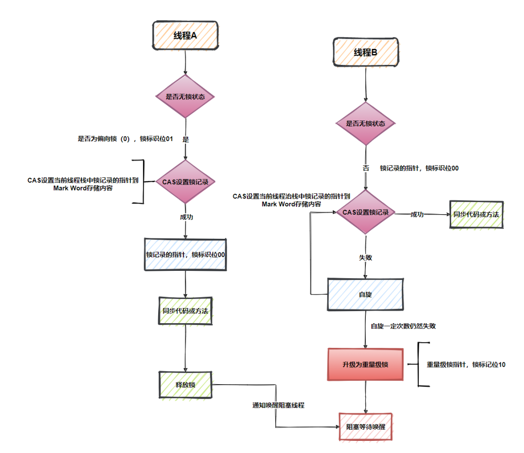 线程执行同步代码或方法前,线程只需要判断对象头的Mark Word中线程ID与当前线程ID是否一致,如果一致直接执行同步代码或方法,具体流程如下