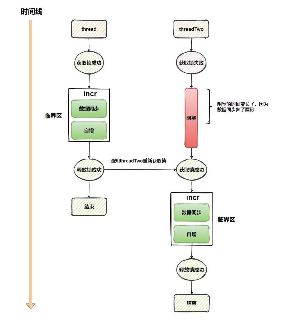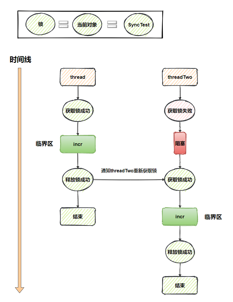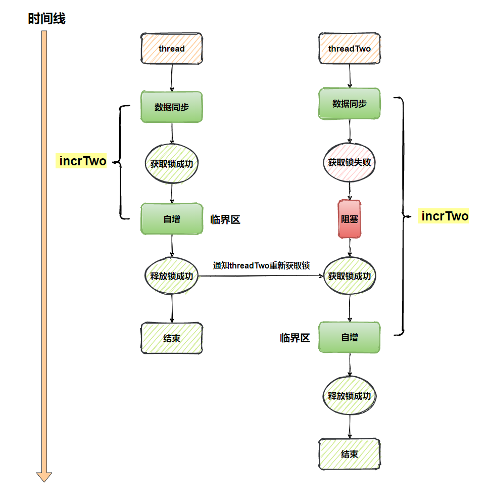 多线程场景下,thread与threadTwo两个线程执行incr函数,incr函数作为共享资源代码段被多线程读写操作,我们将它称为临界区,为了保证临界区互斥,使用Synchronized修饰incr函数即可。